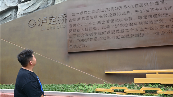 7月17日上午9点,团队成员从康定市出发前往甘孜藏族自治州泸定县,追寻红军长征泸定桥战役遗址。八十多年前,红军战士们不计牺牲攻下泸定桥,为今人留下了“英勇顽强、家国责任、自力更生、坚守信念”的泸定桥精神。仰观大渡河上铁索连成的泸定桥,结合前一日所见到的川藏铁路沿线建设风采,团队成员更深刻的理解了为什么说川藏铁路建设是属于我们的今日长征。