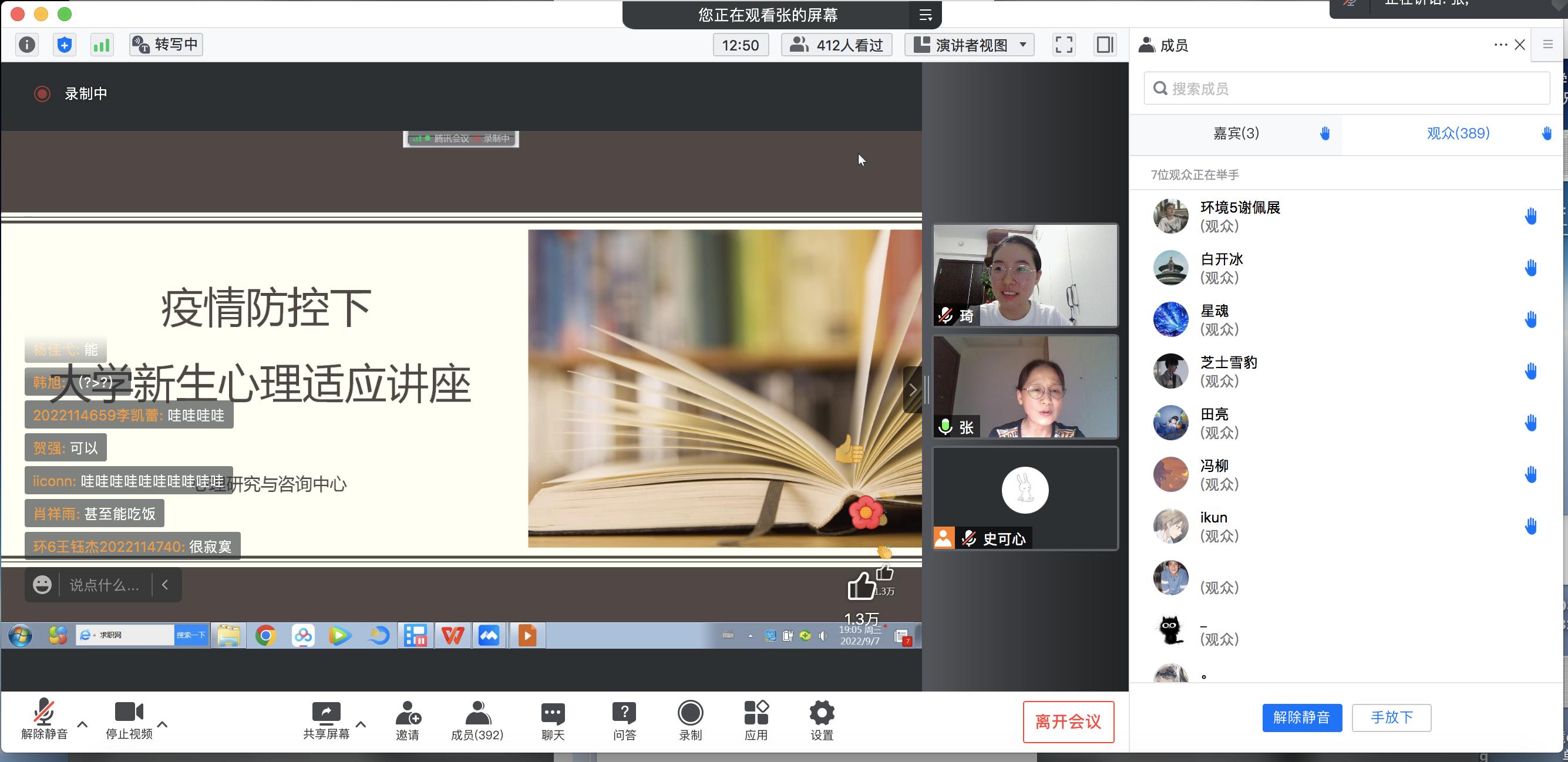 心理工作的史可心老师主持,2022级本科生辅导员翟琦老师和2022级全体本科新生参加。