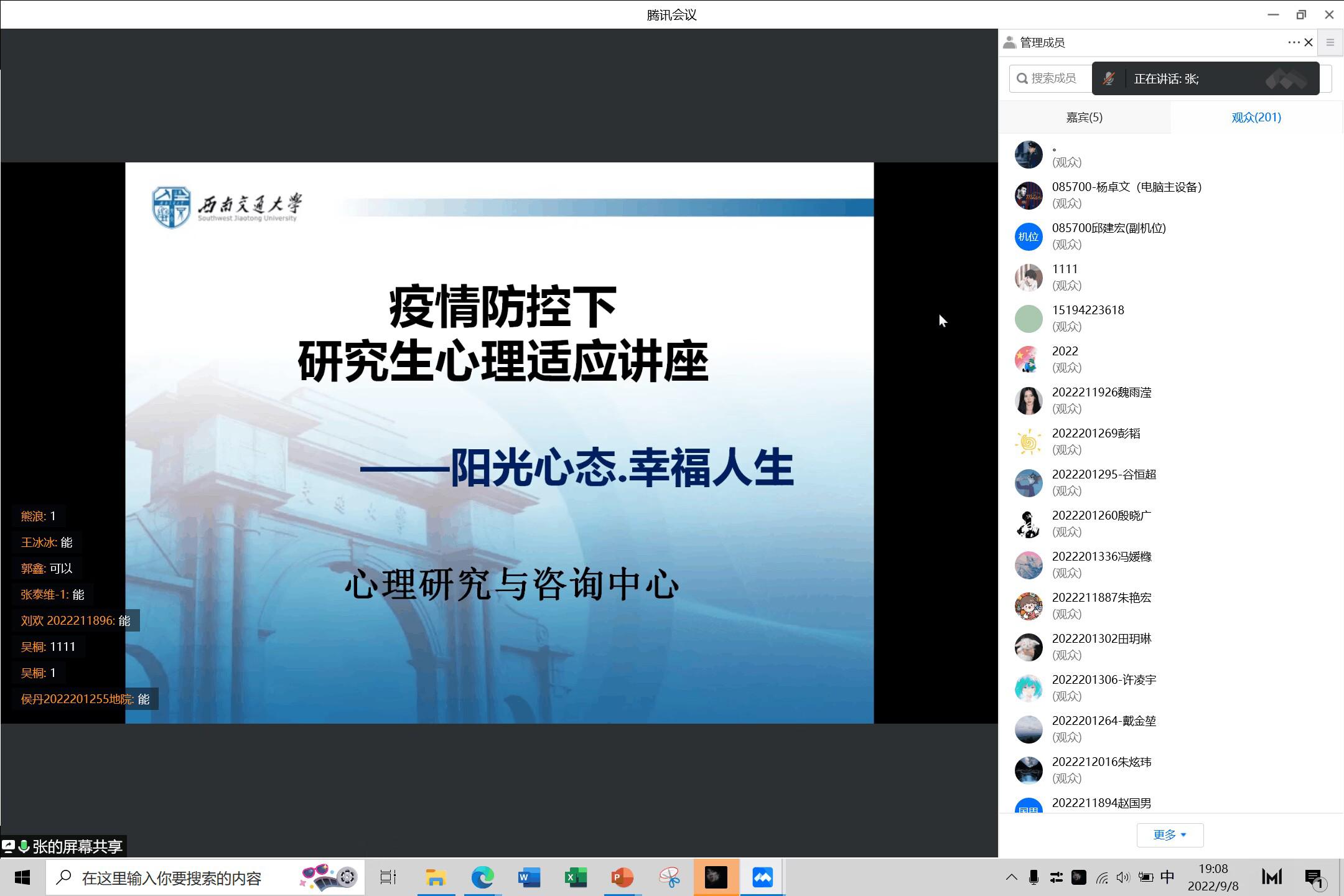 通过腾讯会议举办了以“阳光心态,幸福人生”为主题的心理健康教育讲座。此次讲座由心理研究与咨询中心的张涛老师主讲,2022级研究生辅导员崔宇龙老师主持,分管拉斯维加斯娱乐城