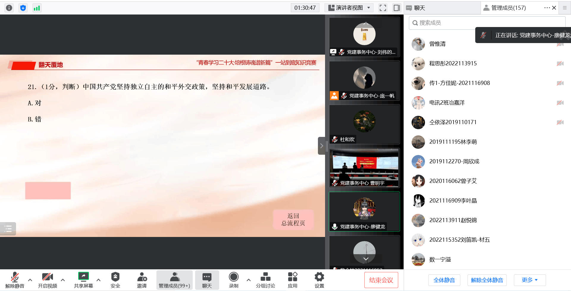 受疫情影响,本次活动采用线上线下相结合的形式,工作人员与参赛选手线下到场,嘉宾与观众线上腾讯会议参会观赛。首先,主持人介绍了各位线上出席的嘉宾,向腾讯会议分会场的观众致以欢迎。决赛参赛11名选手向嘉宾和观众依次作自我介绍。随后,主持人就初赛阶段情况和决赛选手选拔方式作汇报,详细讲解了决赛赛制。至此,本次一站到底知识竞赛决赛环节正式开始!