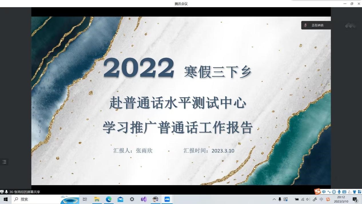 赴普通话水平测试中心队的代表张雨欣同学带来了他们学习推广普通话工作的报告。