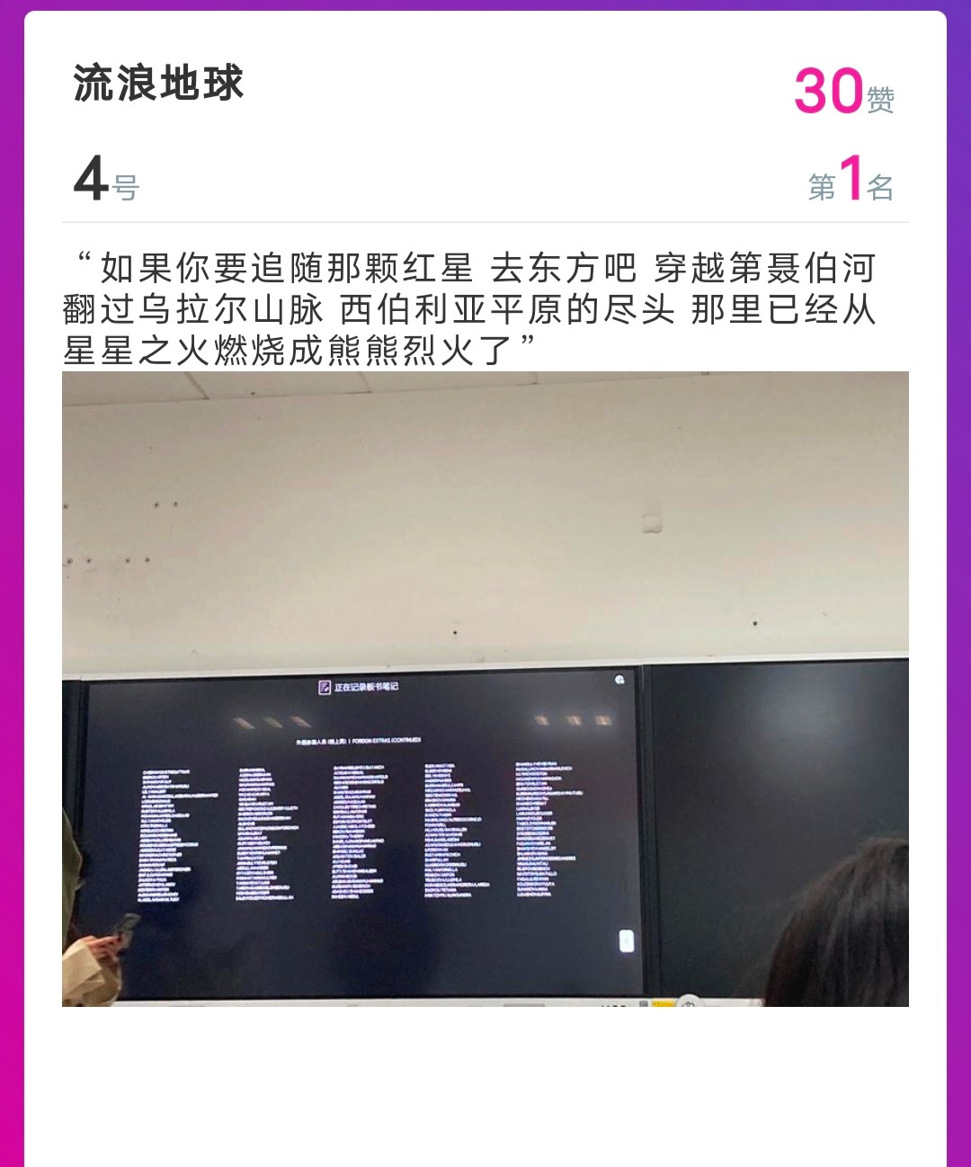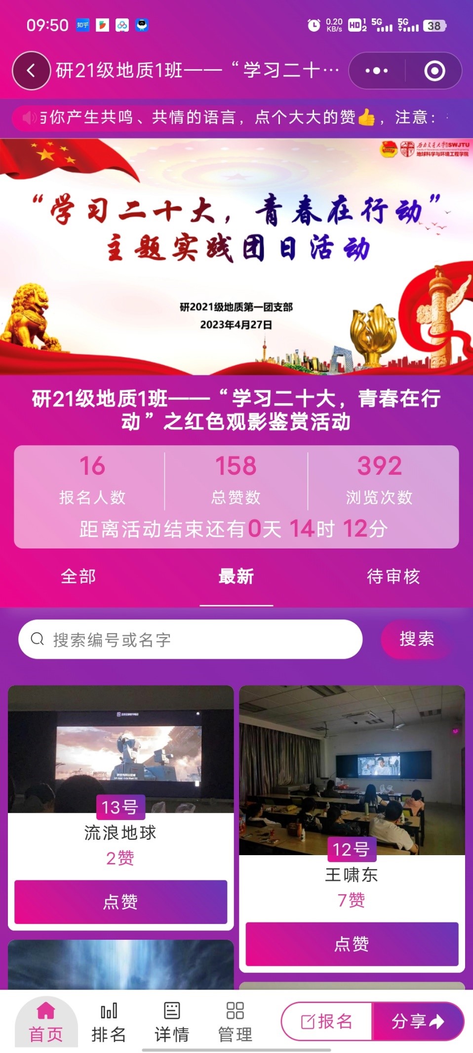 研2021级地质第一团支部以观看爱国主题教育电影《流浪地球2》的形式开展了主题实践团日活动,在观影过程中,通过影评互动通道,同学们将观影中印象深刻的台词或是某种品质精神通过文字编辑在小程序中,传递从影片中汲取到的精神力量,同学们对那些能产生共情共鸣的语言文字点赞。影片结束后,根据互动平台上的点赞情况,对获赞多的同学颁发了活动纪念品。通过此次观影活动,进一步激发了同学们的家国情怀和奋进热情,鼓舞了他们主动肩负时代重任,自觉践行初心使命,立足本职工作,为我国的高质量发展贡献青春力量。