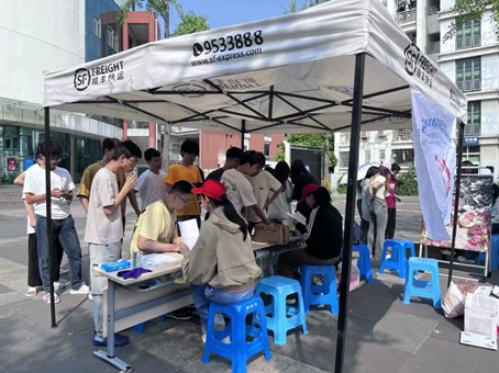 上午九点活动正式开始。本次活动志愿者共分成四组,从上午九点持续到晚上六点,始终站在为同学们服务的第一线上。志愿者们将精心挑选的鲜花摆放整齐并贴好标签后,吸引了许多同学前来询问和兑换鲜花。对于同学们的好奇与疑惑,志愿者们做出耐心、细致的解答,及时帮助前来参与活动的同学搬运鲜花、登记废品兑换的分数。活动现场还设有环保知识问答环节,帮助同学们巩固和拓展环保知识。与此同时,机动组的志愿者们驱车穿梭于南区和北区各个学生宿舍,帮助废品较多的同学将废品送往活动场地进行称重和积分兑换,整个活动现场热闹而有序。