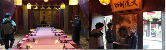 调研团队随后参观了酒庄内以春秋战国至宋元明清各个朝代为主题的餐厅,在历史的氛围中体悟酒俗的传承。团队还记录下了“头酒敬天地、二酒敬长者”的宴席习俗。赵女士指出,这种习俗体现了邛崃人对天地恩赐的敬畏以及对孝道的传承,通过这种仪式,不仅强化了社群认同感,也成为邛酒文化代际传递的重要载体。
