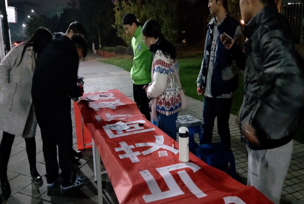 继续前行,参赛者来到最后一个点位。书写着:“与‘艾’同行夜跑活动”的红色横幅,在虹桥的灯光下显的十分鲜艳。参赛者驻步上前,在横幅上写下想对“12.1艾滋病日”说的心里话,并签上自己的名字。同学们写的很认真,晚风中飘逸着一丝丝温馨,希望那些受艾滋病魔折磨的人也能感受的到。
