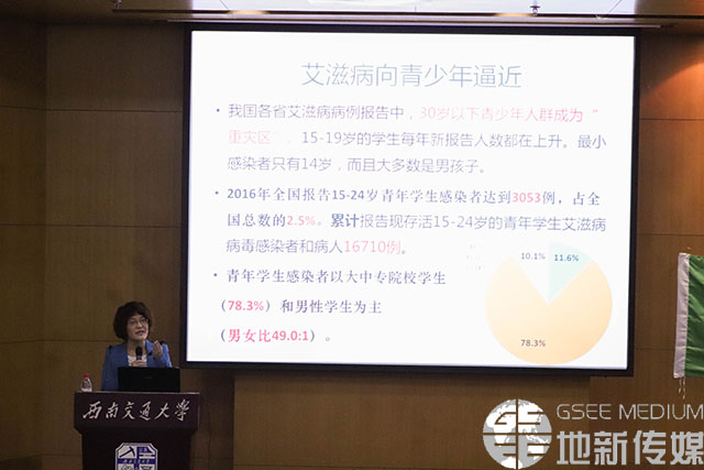 首先,张莉萍对艾滋病公益活动作了简单的介绍。其后,由何勤英进行艾滋病防范教育。何勤英首先提出了“艾滋病离我们有多远?”这一问题,并由此展开。同时何勤英拿出了具有说服力的数据以证明“艾滋病正向青少年逼近”。接着,何勤英从艾滋病的传播方式、艾滋病的危害、高危人群等三个方面介绍了艾滋病的主要特点。随后,何勤英又提出并讲解了一些,如“我身边有艾滋病病毒感染者/病人吗?”“嗨冰和艾滋病有关系?”等同学们平时不甚了解的有关艾滋病的问题。同时,何勤英为同学们介绍了艾滋病流行的因素、艾滋病流行的地区、成都地区的艾滋病疫情的相关情况,又以自己工作中遇到病人一朝不慎染上艾滋的例子为同学们敲响了警钟。