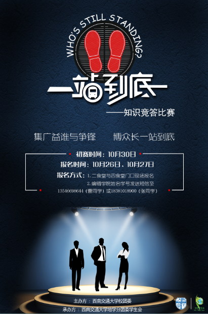 “集广益谁与争锋,博众长一站到底”。十月下旬,一场集挑战性、趣味性、科普性、全民参与于一体的校园大型竞赛活动将在交大开展。霸气的宣传词,庄重的海报,引人注目的主题……“一站到底”知识竞答比赛热度飞速上升,不少同学跃跃欲试,纷纷投身知识海潮,在交大激起朵朵学习的浪花。