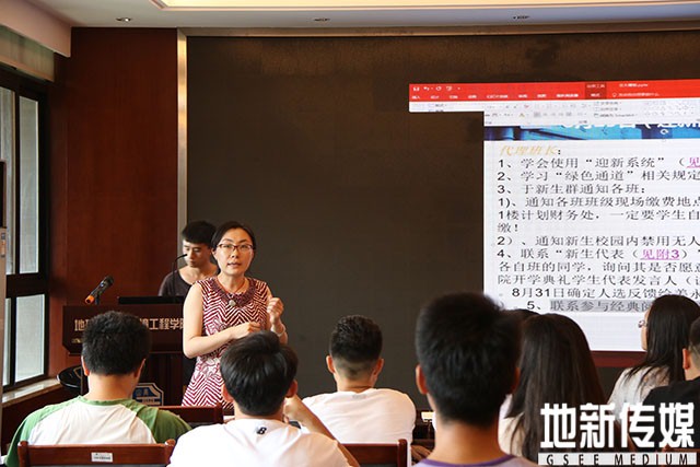 接着姜永杰介绍了迎新现场的主要工作,包括各学生组织工作时间以及迎新物资发放等主要工作。