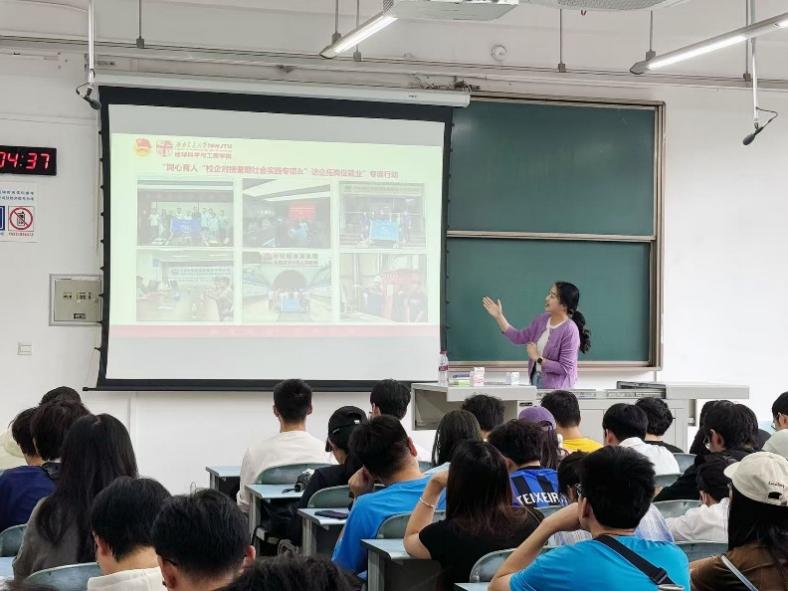 在实践育人方面的丰硕成果。在“硬联通”方面,聚焦川藏铁路博士建设服务团:五年间,团队暑期扎根沿线工程段,开展地质勘察与技术调研,以实际行动服务国家重大工程,彰显“交通强国”使命担当。“软联通”部分,韩老师分享了“红石榴训练营”通过文化沙龙和专题研学强化中华民族共同体意识的经验,并展示了优秀校友访谈成果,为同学们的成长路径提供有益参考。“心相通”环节,则通过介绍团学组织深入社区开展课业辅导、走进乡村助力农业发展的志愿服务案例,呈现青年学子与社会的深度融合,树立了社会化能力培养的生动典范。