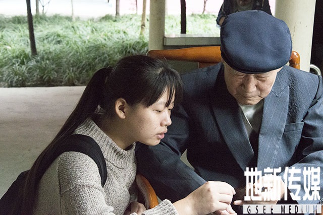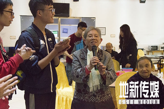 同学们也同老人分享了自己家乡近些年来的建设情况。此外,志愿者们还为老人们献上了精心准备的文艺节目,一首《甜蜜蜜》拉开了表演的序幕。一蓝衣爷爷拿出手机将同学们的表演给记录了下来。