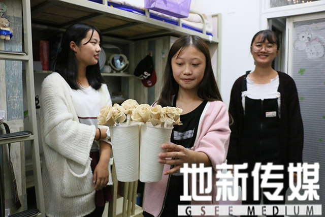 “ 希望未来的精神文明寝室干净整洁,树立起榜样作用,带动地院寝室良好风气。”翟琦这样说。走进寝室,大一新生将其布置的温馨舒适,远看干净整洁,近看又将每个人的性格体现的淋漓尽致。每打开一扇门,就是打开了一份惊喜。男生寝室追求青春的热血,展示自己的热爱,渲染书香的氛围。女生寝室心灵手巧,温柔可人,用废弃的奶茶杯和多余的墙纸做了鲜活的玫瑰,极大的凸显了环保自然的主题,又极具创意,赏心悦目。