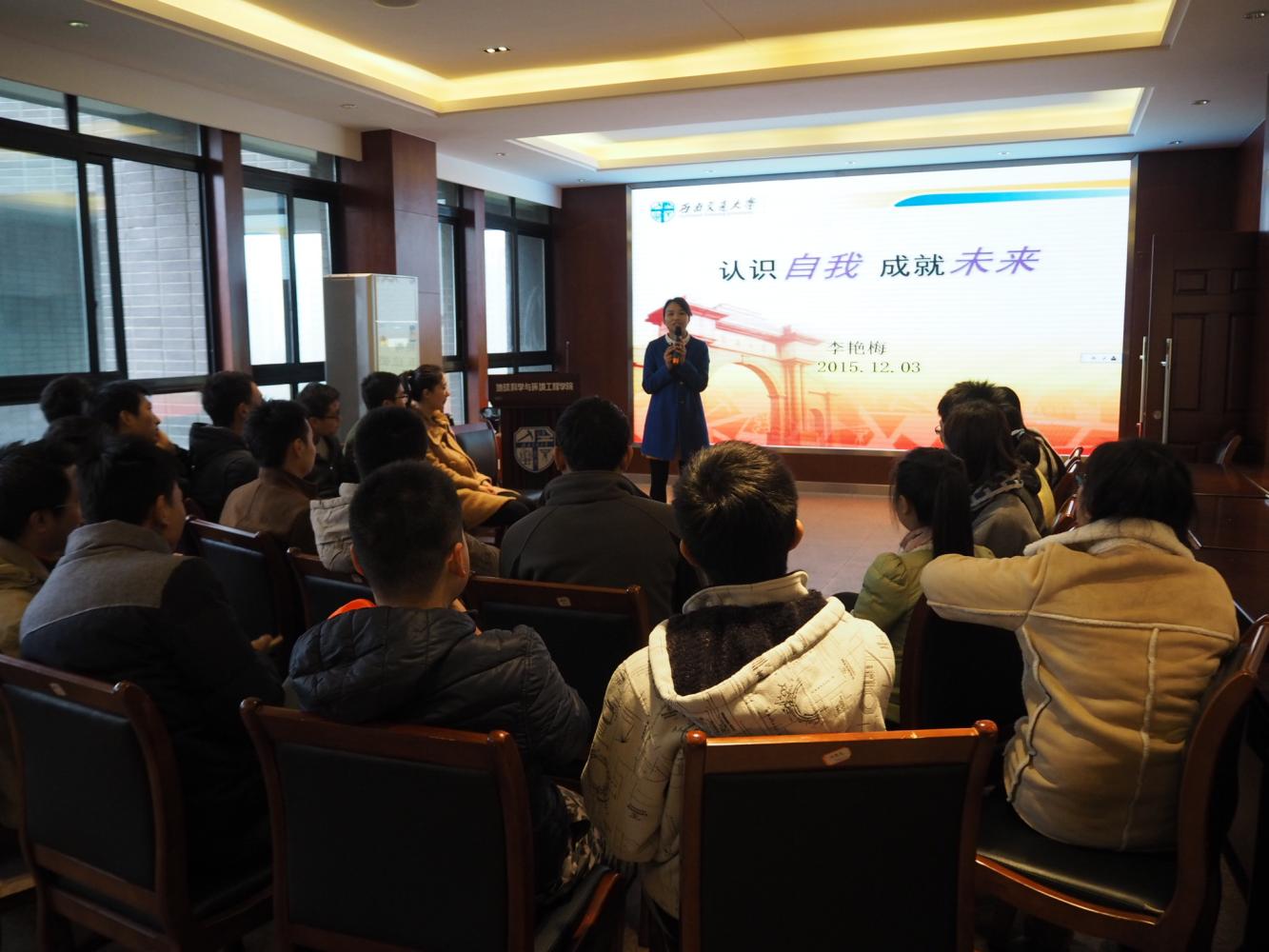 研究生2015级测绘一班在X4520举办了题为“认识自我,成就未来”的班级学风建设活动。活动由地学研会科技部承办,李艳梅老师担任本次活动的主讲嘉宾。