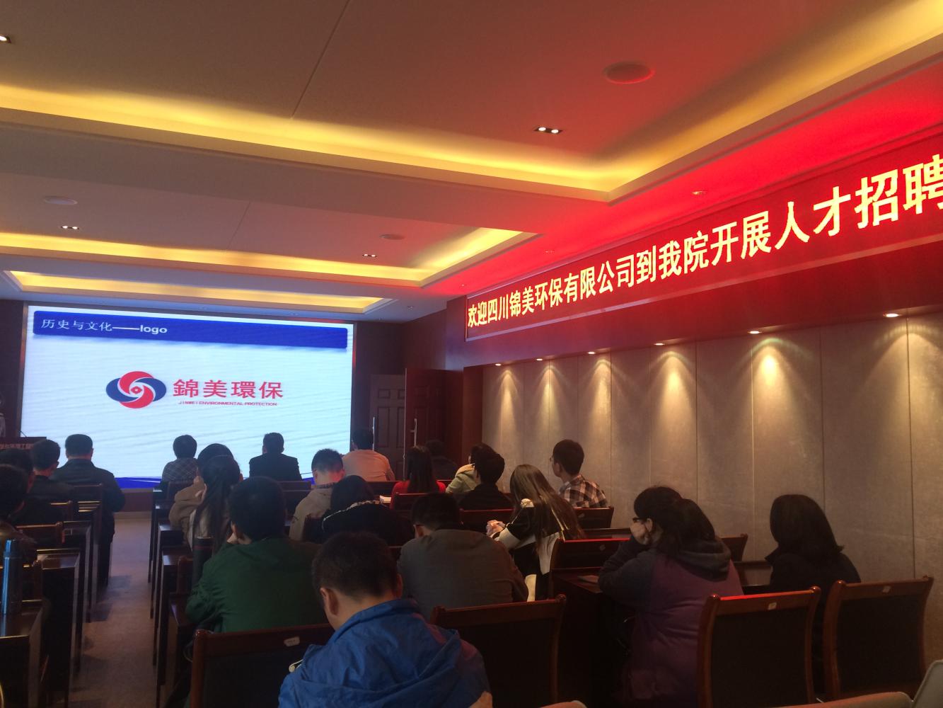 公司负责人先是以幻灯片形式介绍了企业概况,拉斯维加斯娱乐城,发展历程等同学们十分关心的方面. 四川锦美环保(集团)科技有限公司成立于2011年,是专注于提供系统环境方案,解决环境综合问题的第三方综合性合同环境管理高新技术企业。主要致力于为企业、政府及相关事业单位提供第三方环境影响评价、环境监理、水土保持和环保可行性研究等环保技术咨询服务;第三方环境检测及检测运营服务;第三方水污染治理工程设计、施工、运营一体化服务。通过2年来本着“以人才为立足之本以创新为发展之源以诚信为生存之道”的不断努力获得环境质量认证证书(EMA)、质量计量认证证书(CMA)、国家级高新技术企业证书等荣誉。