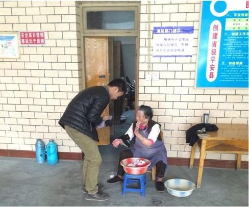 在我们正前方的是一个院子,在门的右手旁是几栋住宿楼,老人们就住在里面。当我们到达时,有几位老人在园中散步。通过交谈,老人告诉了我们他们的情况,大多是因为子女工作在外比较忙,没时间照顾他们,他们才被送到这里,也有的是无儿无女,孤独一身地生活。他们中有的是军人,有的曾经是教师,落寞的眼神、被岁月碾过的沧桑脸庞、驼掉的脊背让我们的心不禁地揪紧。养老院中还有数位年龄高达99岁的老人,他们都已行动不便,吃穿住行都需要护理人员服侍。