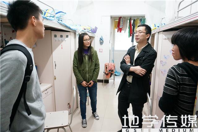 在2014级辅导员杨都强老师和刘海龙老师的陪同下,傅尤刚书记首先来到15号楼女生寝室看望女同学。一看到同学们,傅老师便拉家常似的与他们亲切交流,详细地询问了同学们日常生活与学习情况。此外,对着一群刚来到大学不久的孩子,傅老师给出几点建议:平常生活中,遇到什么困难,应积极找辅导员求助;而对于学习,则告诫大家一定要好好学习,大学不能被荒废掉;细心的傅老师还提醒大家,成都天气可能比较潮湿,应常打开窗户透透气。对于女同学,傅老师特别提醒要注意安全。