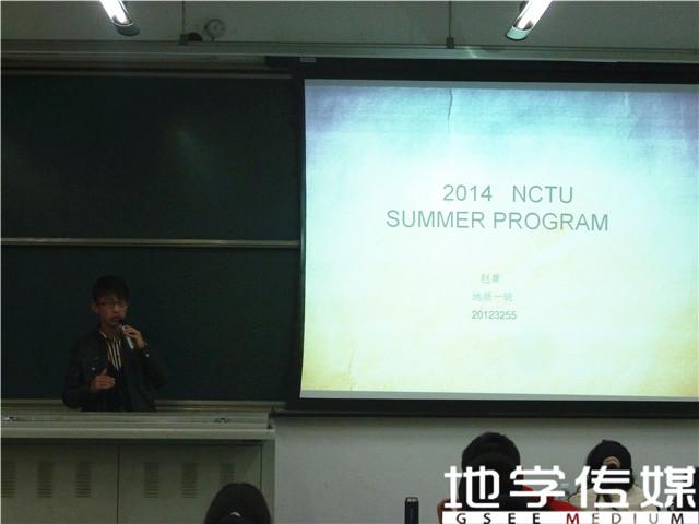 接下来上台的是从台湾新竹国立交通大学学习归来的赵熹同学。赵熹从自己的游学感悟说起,指出台湾是小清新的天堂。赵介绍说,国立交通大学的学风严谨,作息时间安排很紧,学校的管理十分严格,到台湾学习对有内地学生来说绝对是一种挑战。他提醒同学们,国立交通大学暑期项目申请难度会越来越大,有意向的同学应尽早采取行动。对于同学们关心的此项目的申请条件,学长指出,平均成绩需75+,四六级需要高分,最好有参加社会活动的经验。着重提到,简历要有亮点,这样才能给审批的老师留下深刻印象。最后,赵熹学长将自己在台湾的一些照片分为学习篇、生活篇、美食篇一一展示给大家,分享了在台湾学习生活的点点滴滴。
