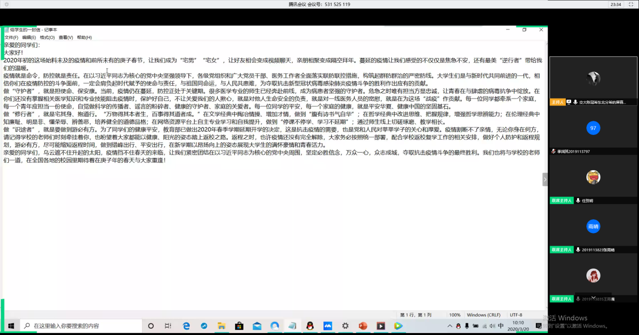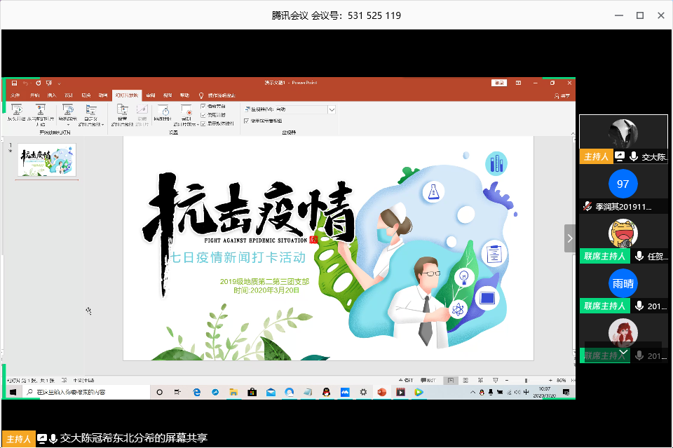 三月二十日早晨,地院地质二三班,用腾讯会议在线开展了“疫情防控,七日疫情新闻打卡”主题党日活动,全体人员进一步了解疫情的现状,讨论研究当今现状,发表自己的感想。
