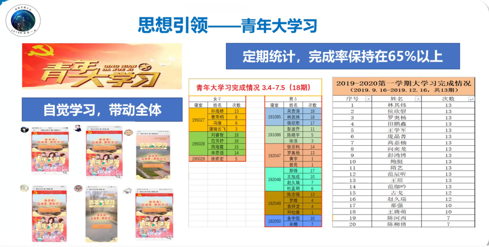 答辩开始,全体人员起立,奏唱国歌,同学们都进入到了庄重严肃的氛围中。答辩会上,报名参与答辩的几位优秀团支书代表团支书结合自身特色,从个人思想建设、班团建设、个人荣誉等多方面展开答辩。通过网上在线控屏进行展示答辩,充分展示了各团支书的良好精神面貌和综合素质。带领良好班风,增强同学们的团结意识,团支书们都尽心尽力,令人倾佩。答辩过程中,各个团支书从不同的角度展开介绍了自己在2019年一年取得的成绩、荣誉和进步。