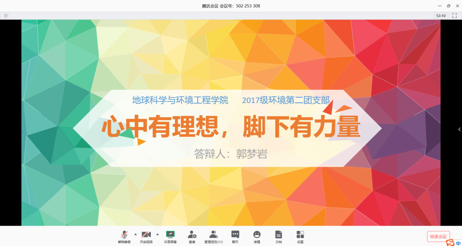 其中,17级环境第二团支书郭梦岩同学以对团支部的引领和对同学们的思想建设引作为切入点,列举了她作为团支书带领支部成员一年来获得的支部荣誉,赢得大家的高度赞扬,郭梦岩同学优秀的成绩和积极的态度得到了大家的一致认可;17级测绘第一团支部团支书杨汉纯同学从组织的团日活动展开,让同学们看到了他作为团支书的尽职尽责和作为学生的勤学好问;18级遥感第一团支部的团支书林其炜同学在自身的兴趣爱好、获得的荣誉等方面一一为我们进行了介绍,也让大家为他的优秀鼓掌。
