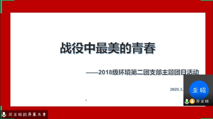 2020年3月19日星期四下午三点2018级环境2班如期举行2020年第一团日活动——“战役中最美的青春”。辅导员杨老师因要参加本次活动。由于新冠疫情的影响,此次活动采用腾讯会议线上进行。本次活动由团支书厉亚昭主持。