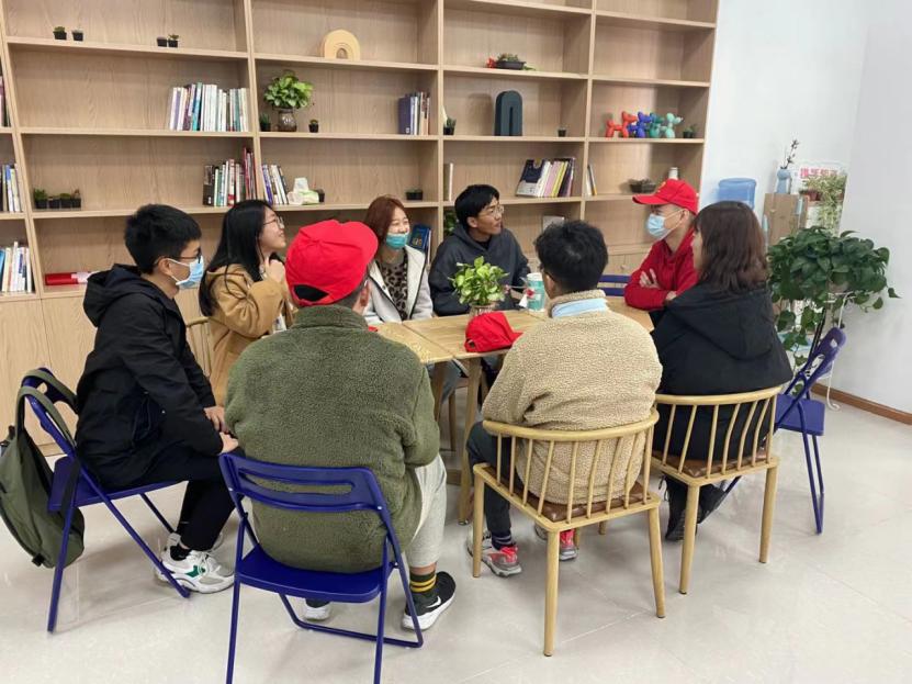 与几位老师见面后,志愿者们先是在知子花服务中心一块坐下简单聊了聊九班同学们的情况,对班级有了一个初步的了解,再共同出发前往郫都一中。