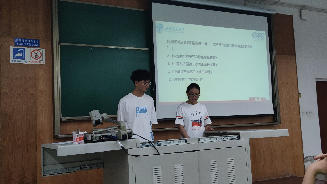 由西南交通大学校团委主办,地学学生会承办的“忆建党峥嵘岁月,展青年鸿鹄才志”“一站到底”知识竞赛复赛于5月8日,5月9日在犀浦校区X4151,X4152,X4156,X4157圆满结束。25名参赛选手经过两轮激烈的角逐之后,共有10名选手进入决赛。