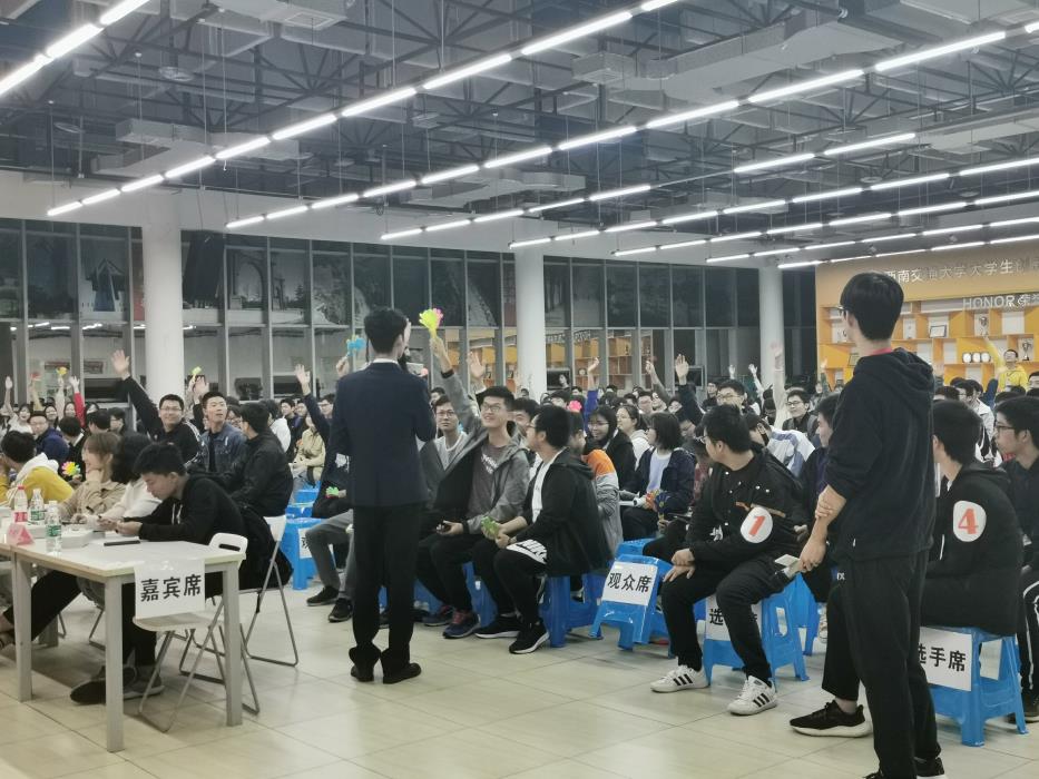 承办的第六届新生文化节“庆七十华诞,记初心使命”一站到底知识竞赛决赛在三食堂三楼隆重开幕。此次活动旨在推动校园文化建设,提高大学生综合素质,拓展大学生视野,丰富大学生的课余生活。