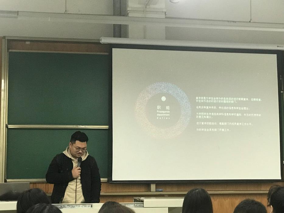 学生会于2019年3月7日晚在X4152教室举行了2018-2019学年院学生会部门述职大会。会议由学生会办公室部长主持。