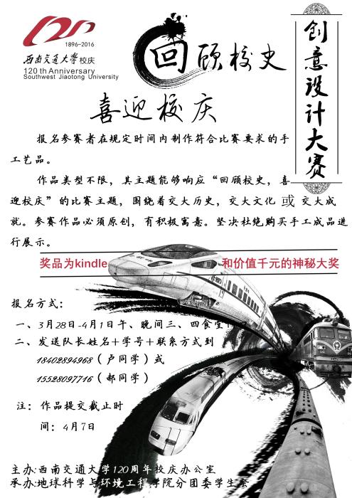 即将举办一场“回顾校史,喜迎校庆”创意设计大赛。去铭记该属于我们的辉煌,去传承该属于我们的交大精神。作为交大人的我们,赶快行动起来,用手工作品的方式来展现你对交大的热爱吧。