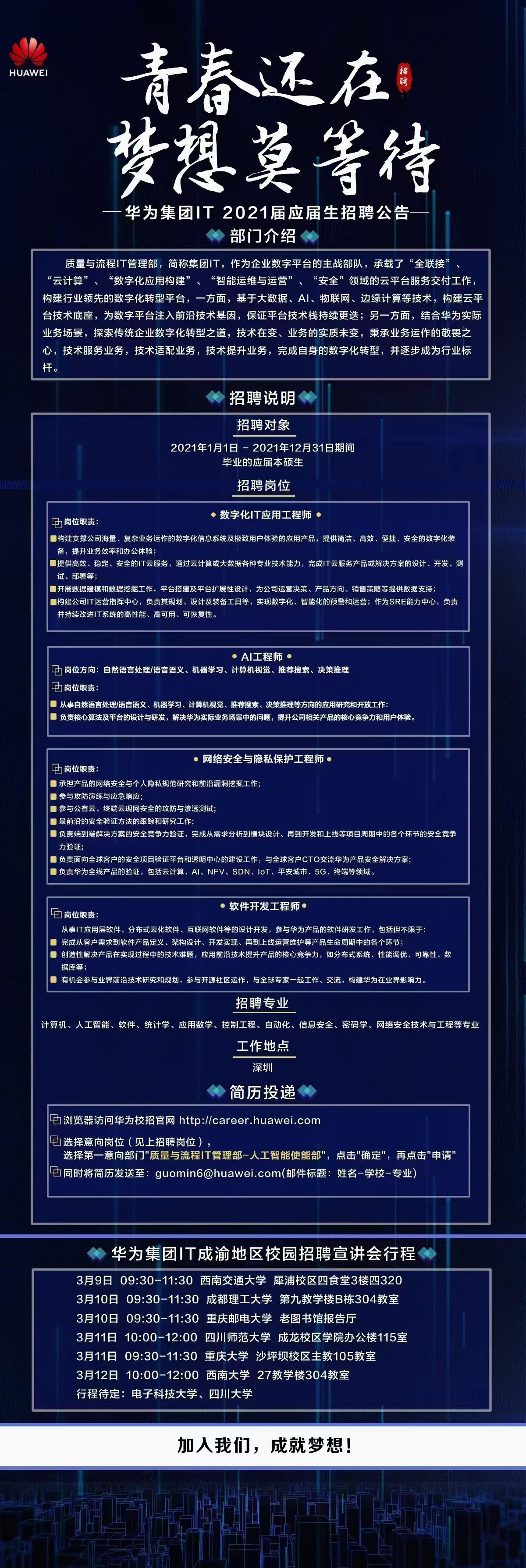 华为质量it春招,3月9号上午9:30犀浦校区四食堂3楼320室,等你们!带好简历来吧!