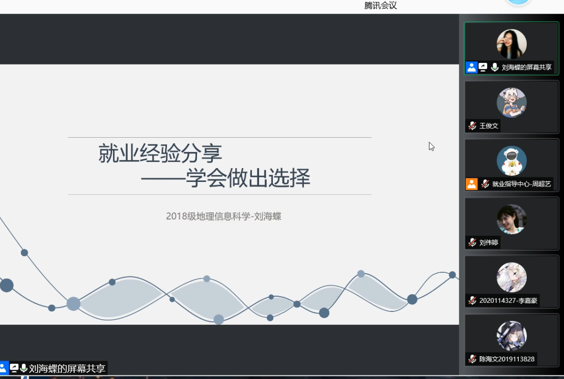 优秀毕业生开展“生涯番茄”就业指导系列第一期讲座,本次活动通过线上平台“腾讯会议”进行,主讲人为我校2018级地理信息科学毕业生,现已签约上海华测导航技术股份有限公司的刘海蝶学姐,刘海蝶学姐作为预备党员,始终以身作则,现举办主题为“学会做出选择”的活动。