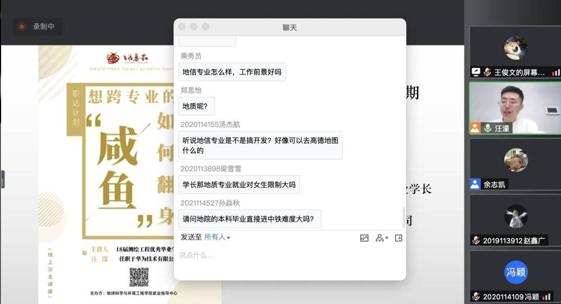 最后,在线上答疑环节,同学们听完汪学长的分享后都进行了积极的提问,学长也根据自己的经验耐心地答疑解惑,参加这次活动的除了面临就业的大三大四同学,还有许多大一新生,充分说明了大家对就业问题的重视。同学们通过本次讲座收获颇多,都对就业有了进一步的认识。