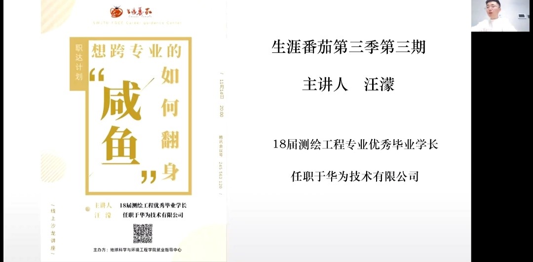 优秀毕业生开展“生涯番茄”就业指导系列第三季第三期讲座,本次活动通过线上平台“腾讯会议”进行,主讲人为我校2018届测绘工程专业毕业生汪濛学长,现任职于华为技术有限公司。活动主题为“想跨专业的‘咸鱼’如何翻身”。