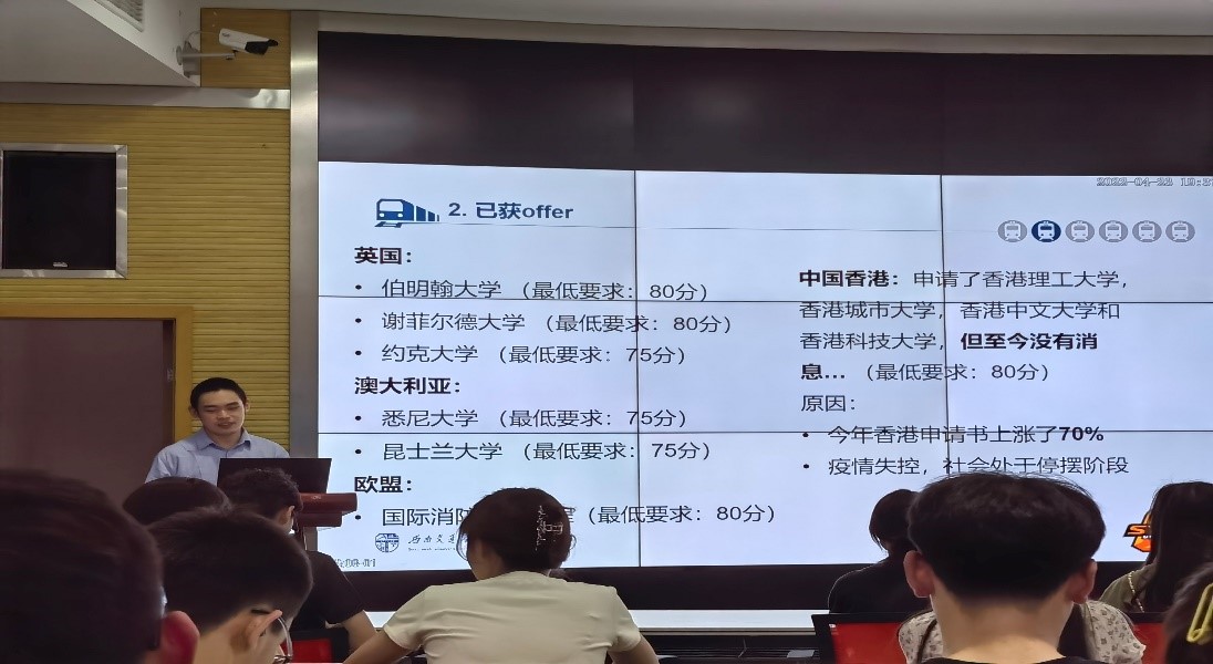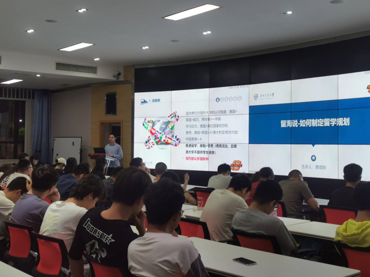 安全工程大四在读优秀学长萧琨铧同学主讲,讲座主题为“如何制定留学规划以及留学的经验分享”。
