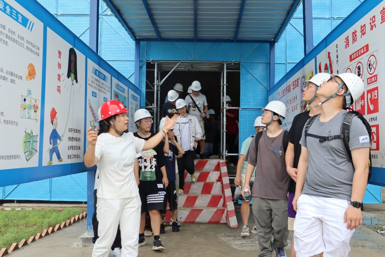何老师向同学们简单介绍了大北区二组团二标段项目的建设计划、各部门员工分工等,着重强调了参观施工现场的注意事项。在确保同学们明确安全要求后,带领同学们参观了项目部基本建成的E区安置房与在建的中学教学楼。参观过程中,何老师详细解说了项目所用的各项新型材料、用于抗震减灾的各项设计、工人作业使用的最新技术手段等,同学们针对员工工作模式、无人机和三维建模等新型测量技术在施工过程中的应用与何老师展开热烈讨论,收获满满。