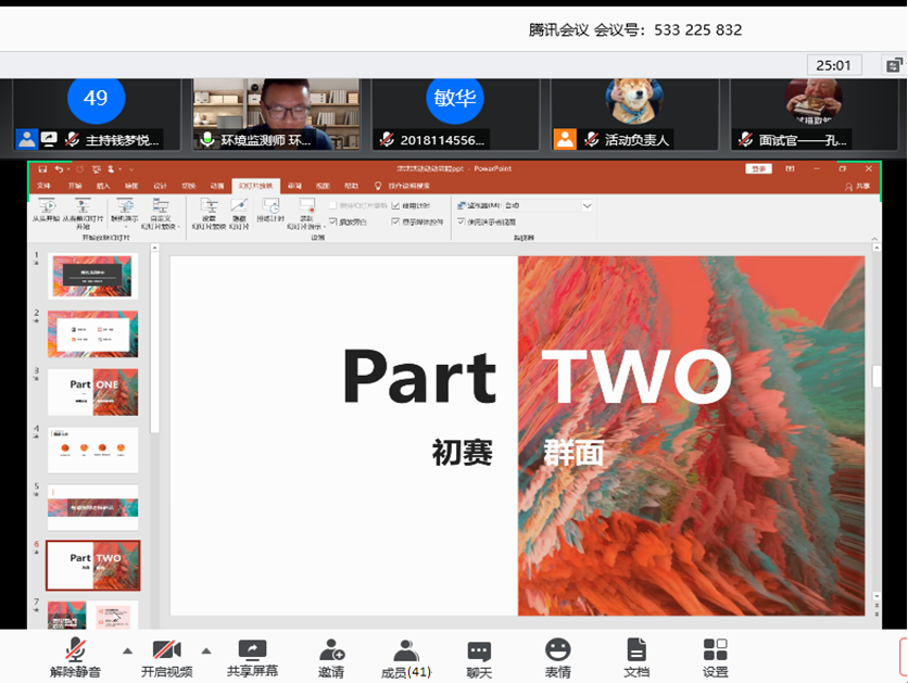所有选手陈述完毕后,主持人宣布进入10分钟自由讨论阶段,这时选手打开麦克风和摄像头进行讨论。经过讨论,选手们发现大家对题目理解有些许失误,并迅速调整过来,重新对题目进行了思考,最后形成了统一的解决方案。该过程结束,工作人员在QQ群里发放参考答案,并进行选手分数统计,最终选出5位优胜者进入复赛。