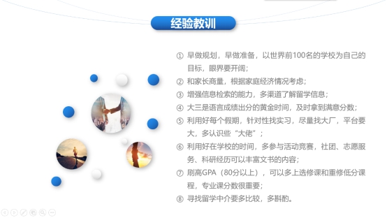 蔡伟健向大家介绍了一些有效渠道来获取留学相关的信息以方便对目标学校的选择与准备。学校官网、留学APP、在读或已毕业的学长和学姐等都是获取信息的有效途径。在收集了充足的留学信息并对留学情况有一定了解后,我们便可以准备相关文书、学术成绩与语言成绩证明、校外实习证明等材料。