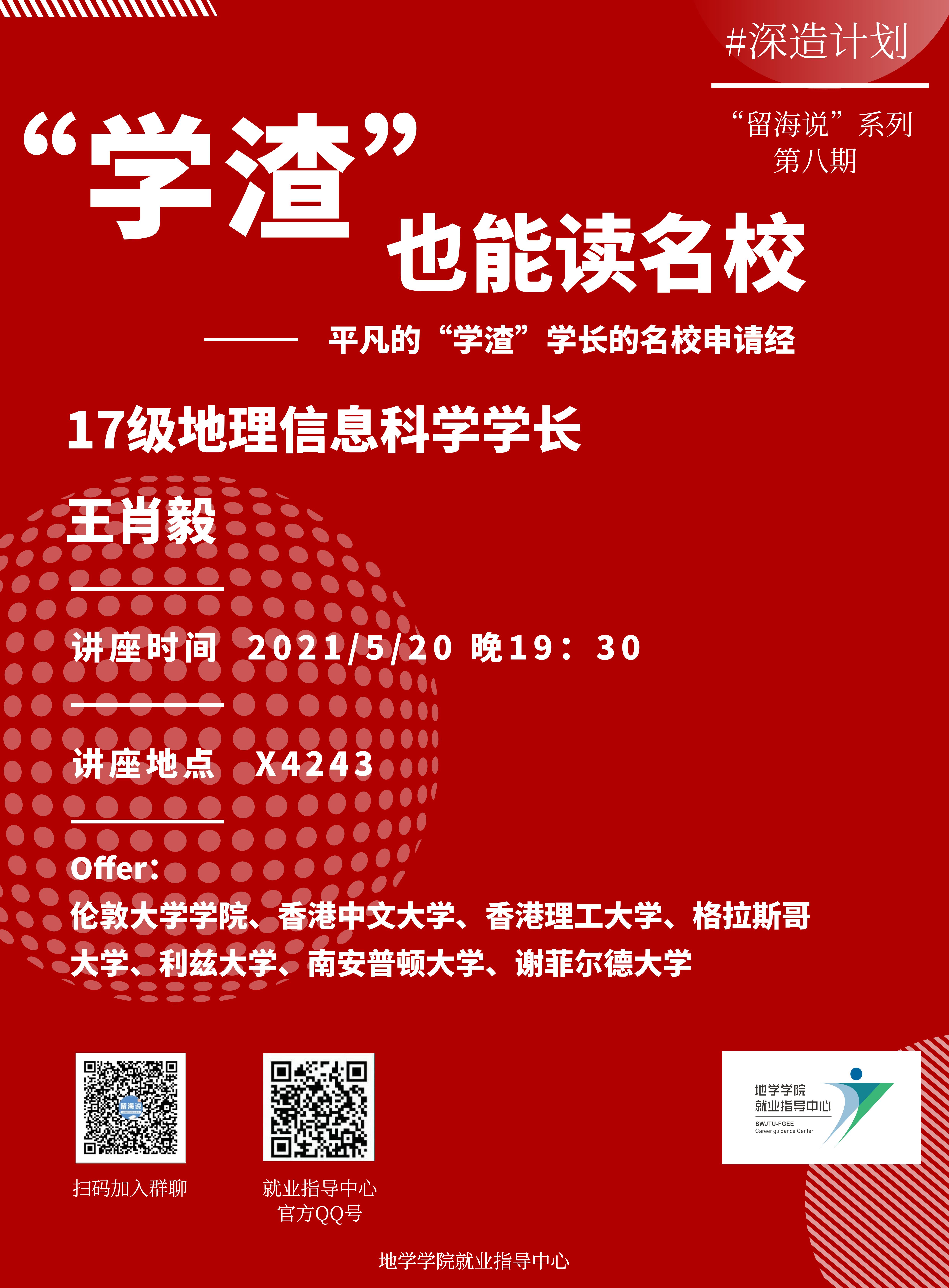 此次活动旨在为有相关留学意愿和需求的本科生与有经验的优秀学生提供交流的平台,分享留学的知识和经验。同时,以他们的亲身经历和丰富的经验给还在彷徨的同学答疑解惑,加深对留学的了解和认知。提高学生国际视野,明确未来的深造规划。欢迎大家踊跃报名参加!现将第八期讲座信息发布如下: