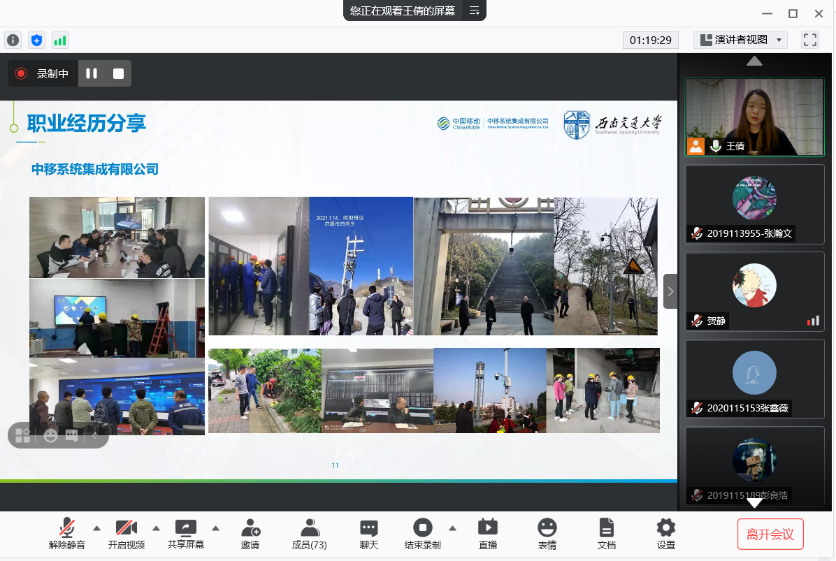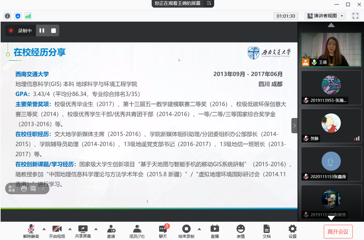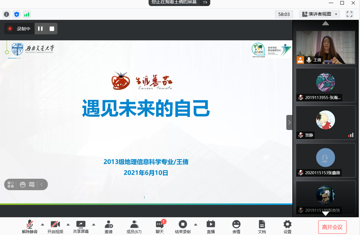 优秀毕业生开展“生涯番茄”就业指导系列第三期沙龙,本次活动通过线上平台“腾讯会议”进行,主讲人为我校2013级地理信息科学专业毕业生,现就职于中移系统集成有限公司的王倩学姐。活动主题为“遇见未来的自己”。