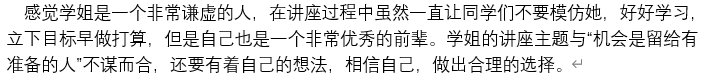 然后,学姐在职业规划方面做出了自己的理解和认识:主动关注招聘会的相关消息,建议同学们尽早做准备,确立目标,力争上游,做好调研了解工作。