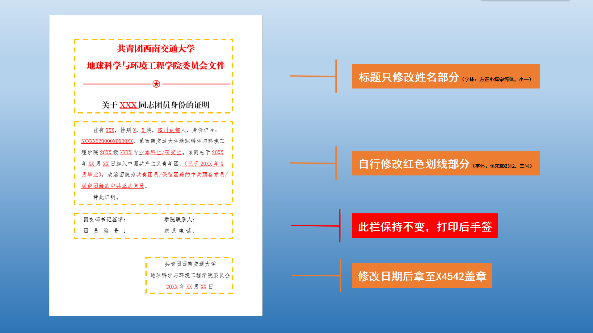 团员身份证明办理流程:请仔细阅读填写指南(附件1),下载并规范填写模板(附件2),填写完毕再打印,联系团支部书记签字并核对团员编号,然后再交至X4542联系老师签字盖章。
