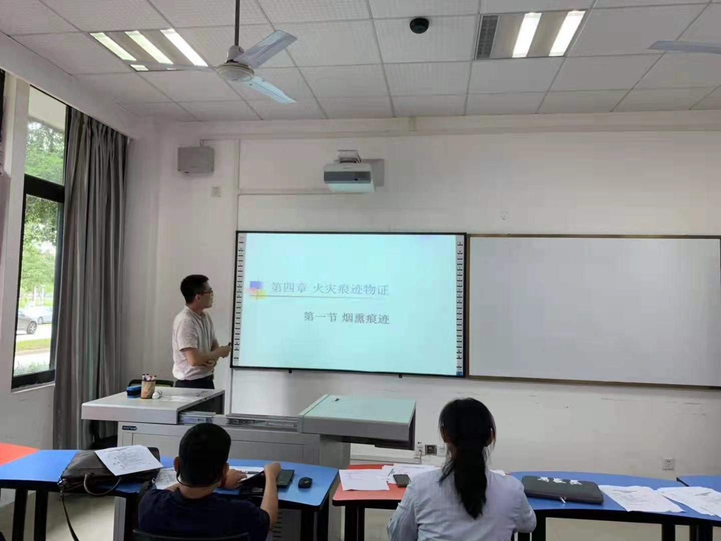 弓亮老师主讲了《火灾调查》这门课程,主要讲授了火灾痕迹物证的烟熏痕迹,介绍了烟熏痕迹的定义,组成,最后详细介绍了烟熏痕迹的证明作用。评委老师建议能否播放一些视频,易于学生感观认识,并引起学生兴趣。