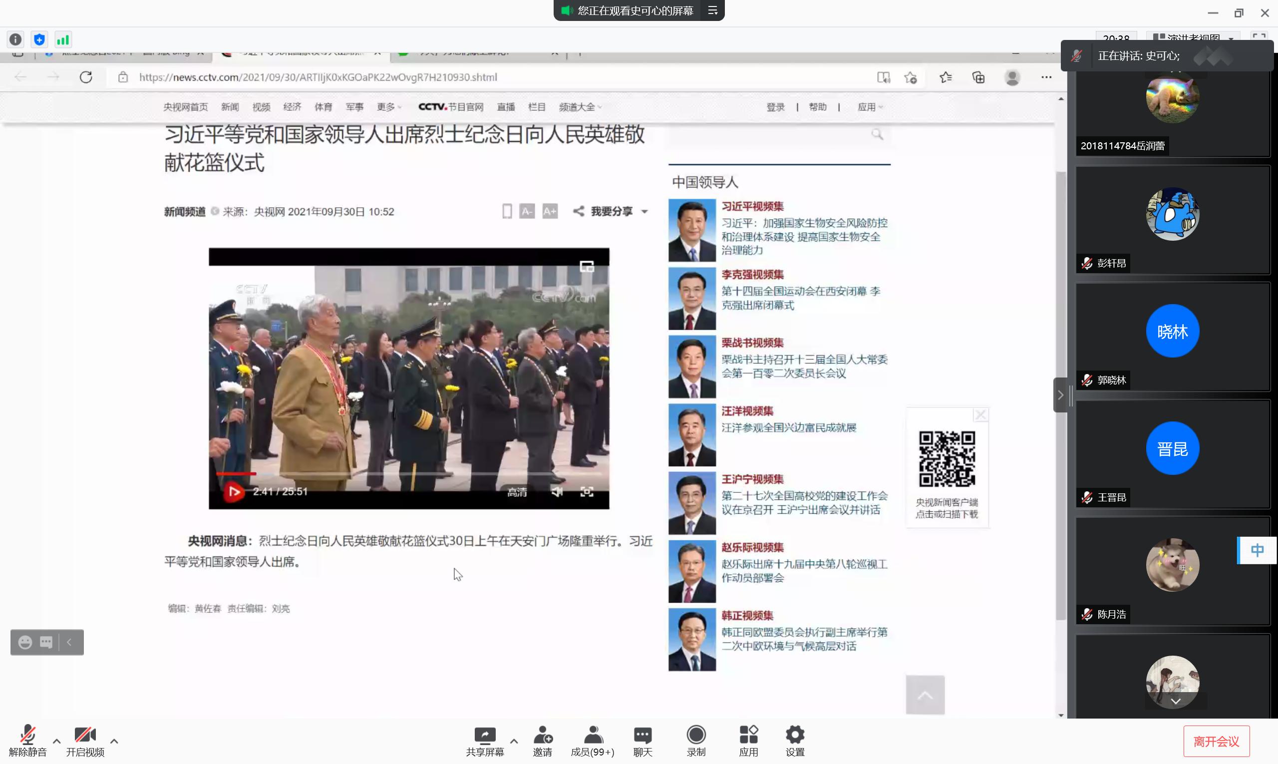 首先,史可心老师为大家介绍了“烈士纪念日”的由来及其现实意义,史可心老师强调今日之盛世离不开每一位为革命事业献身的前辈,革命烈士的每一滴鲜血都不会白流,每一种牺牲都值得我们铭记。接着史可心老师带领全体同学回顾了习近平等党和国家领导人同各界代表一起在天安门广场向人民英雄敬献花篮,缅怀革命先烈的视频,同习近平总书记一同感受天地英雄之气,其中习近平总书记的“我们一定要铭记烈士们的遗愿,永志不忘他们为之流血牺牲的伟大理想”“一寸山河一寸血,一抷热土一抷魂”等语句更是激励着全体党员、积极分子砥砺初心,奋勇前行。
