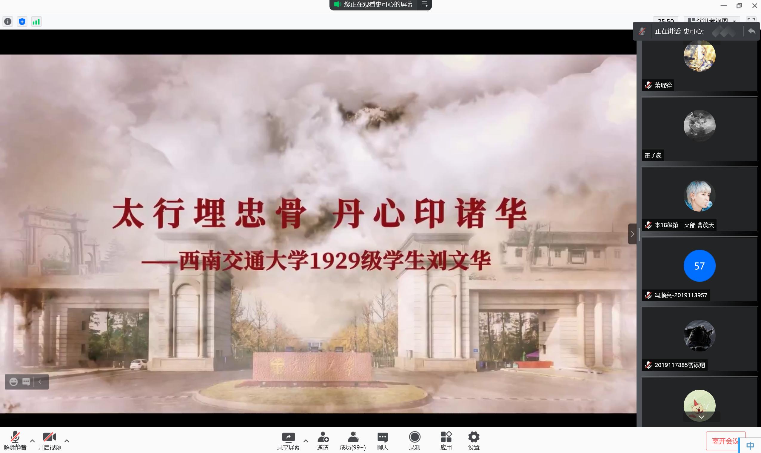 在西南交通大学125年的办学历史中,也涌现出了一批为国家和民族独立、国家繁荣富强抛头颅、洒热血的革命烈士,作为交大学子,我们更应该向他们学习。史可心老师带领全体同学深入了解马玉增、冯亮功、杨杏佛、武胡景等交大革命先烈的伟大功绩。红军英烈冯亮功,为了不给家族带来危险,他告别了年轻的妻子与不满周岁的儿子,与家族切断一切联系投入武装斗争。“两弹一星”元勋——姚桐斌,生于艰苦环境却做出伟大功绩,他曾说道:“只要能把中国的航天事业搞上去,叫我死了也甘心。”这份对党的忠诚与坚定深深感染了大家。