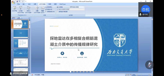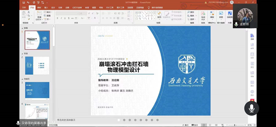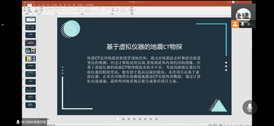 答辩总结:在本次答辩过程中,该小组向评委老师们展示了前期研究成果,但由于疫情影响,野外数据采集未能按期完成。根据该小组的展示内容,评委老师提出了关于地质雷达结构与实验地选择等问题,项目成员也通过这些问题深化了对研究项目的认识。