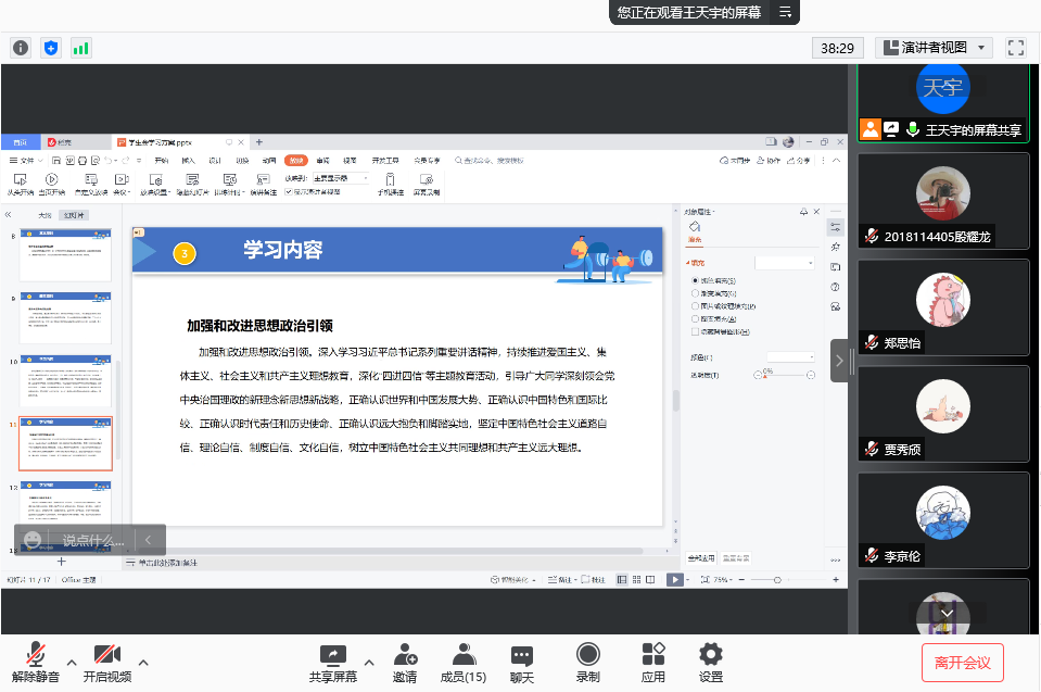 学习结束后,学生会主席团听取了各部门近期工作汇报,并对学代会、篮球赛、迎新晚会等活动做出指导,重申因事请假的问题,强调请假时间和对象。以及群内通知的回复问题,强调开会及其他正式场合的纪律问题,禁止玩手机,禁止随意交头接耳,与会成员应随身携带笔纸对必要内容进行记录。