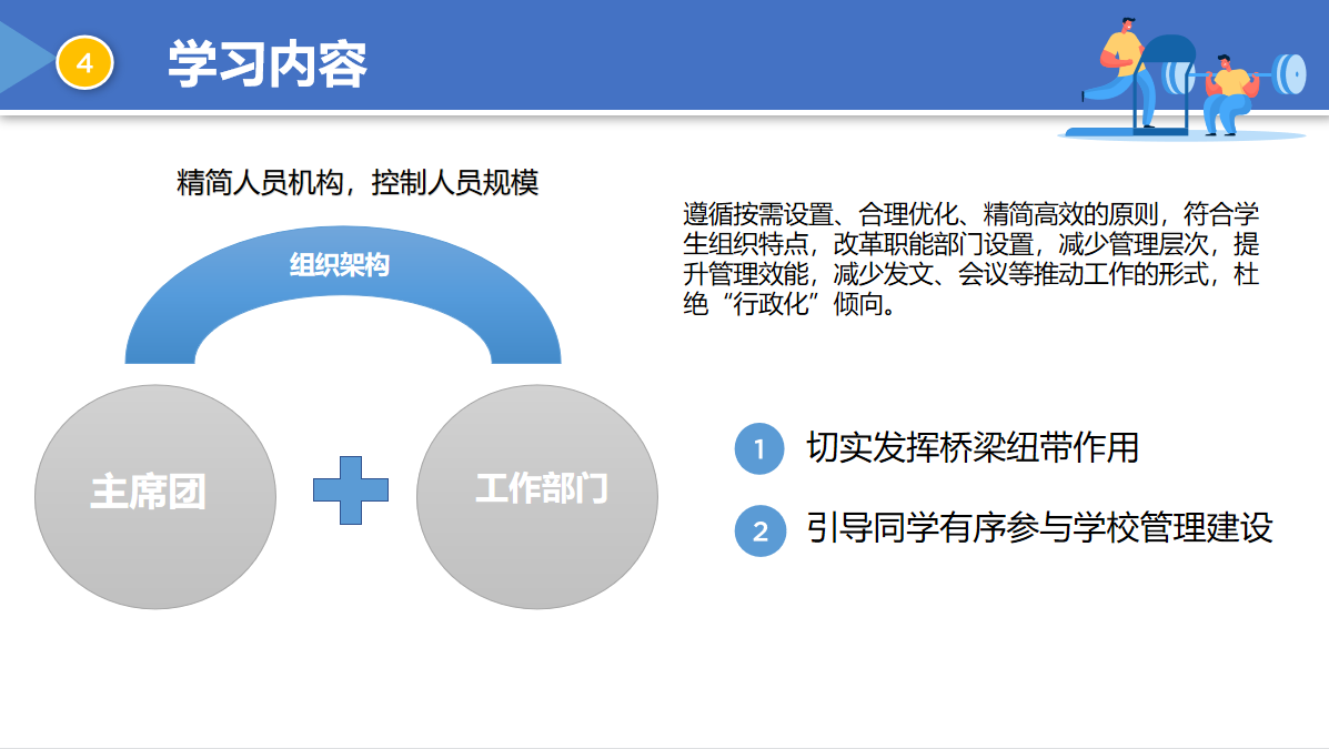本次学习就未来学生工作的主要方向提出意见,在未来的学生工作中,学生会及各学生组织要加强和改进思想政治引领,加强学生干部作风建设,健全学生权益代表和维护机制,规范学生干部的选拔、考核和培养,同时学生会及各学生组织要精简人员机构,控制人员规模,切实发挥桥梁纽带作用,引导同学有序参与学校管理建设。
