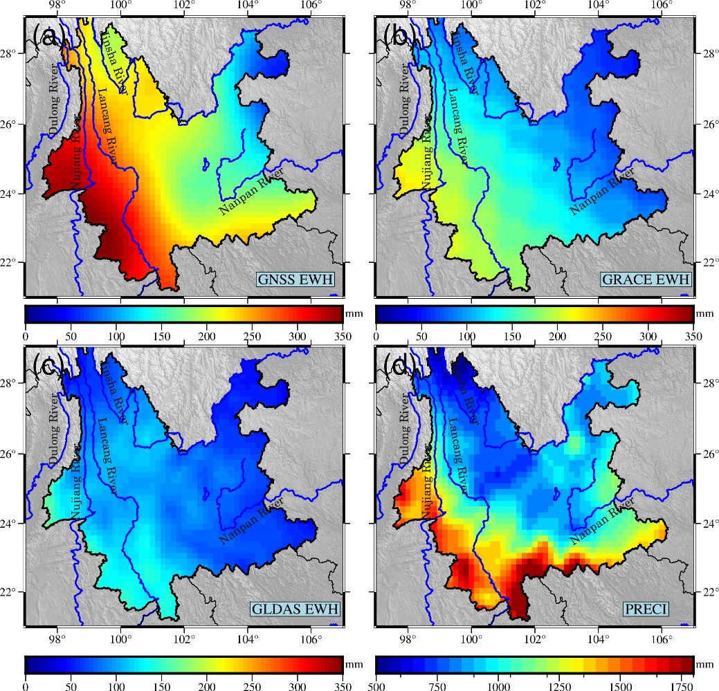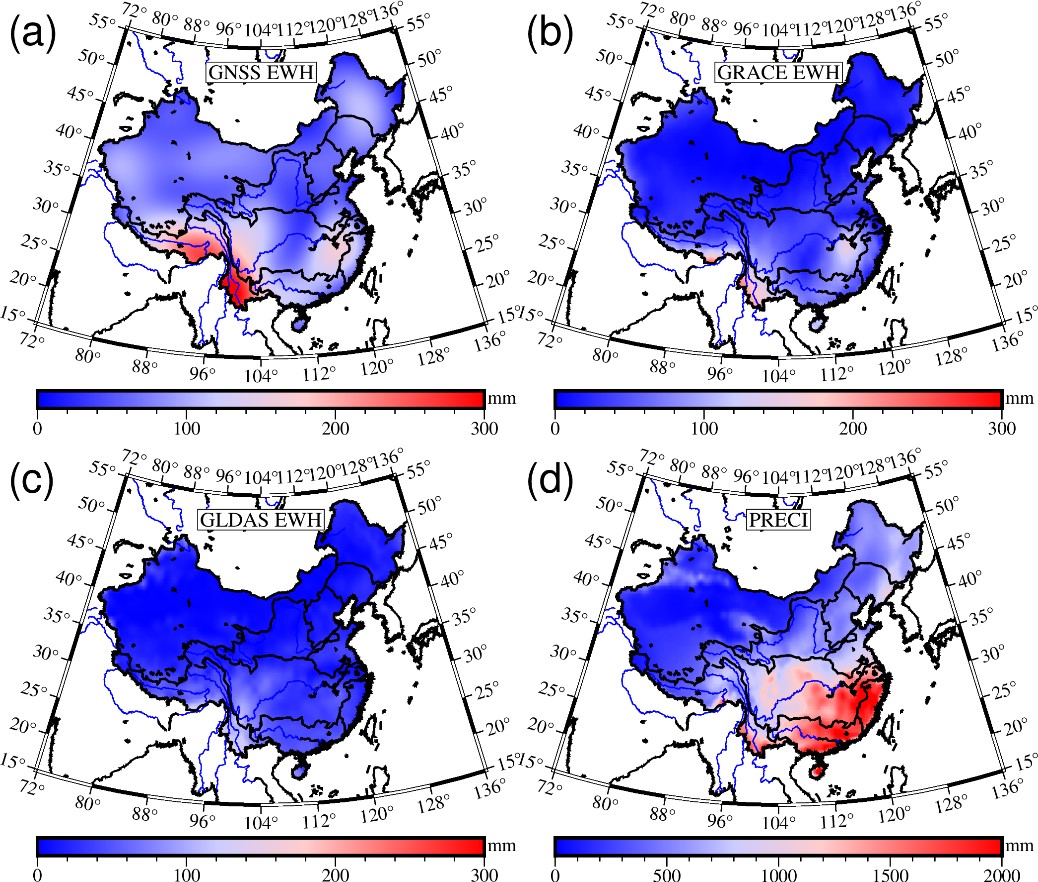 陆地水是自然界中最重要的资源,其对生态维护、农业发展、工业建设和居民生活都有重要影响。定量监测陆地水储量变化并分析其时空特征是地球科学中的重要研究内容。我院姜中山博士、袁林果教授及其研究生团队与台湾“中央研究院”地球科学研究所许雅儒研究员合作,在利用GNSS垂直观测数据监测陆地水储量变化的研究工作方面取得了一系列重要成果。针对不同空间覆盖的GNSS测站分布情况,创造性地实现了基于密集GNSS观测数据的空域陆地水储量反演工作和基于稀疏GNSS数据的谱域陆地水储量反演工作。同时,开展了利用GNSS技术研究极端干旱事件的原创性工作,率先将基于GNSS数据反演得到的陆地水储量产品开发成为一种全新的干旱监测工具:GNSS-DSI,全面证实了GNSS观测资料能够用于极端水文事件的监测和评估。