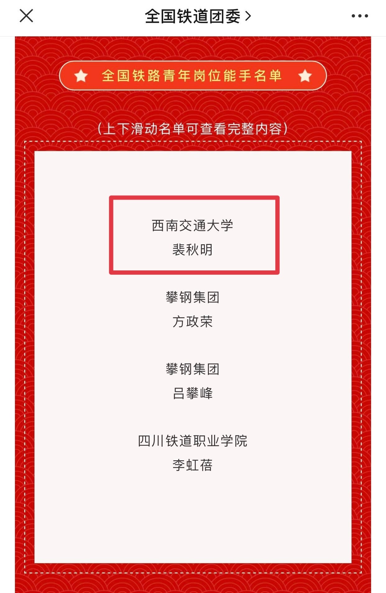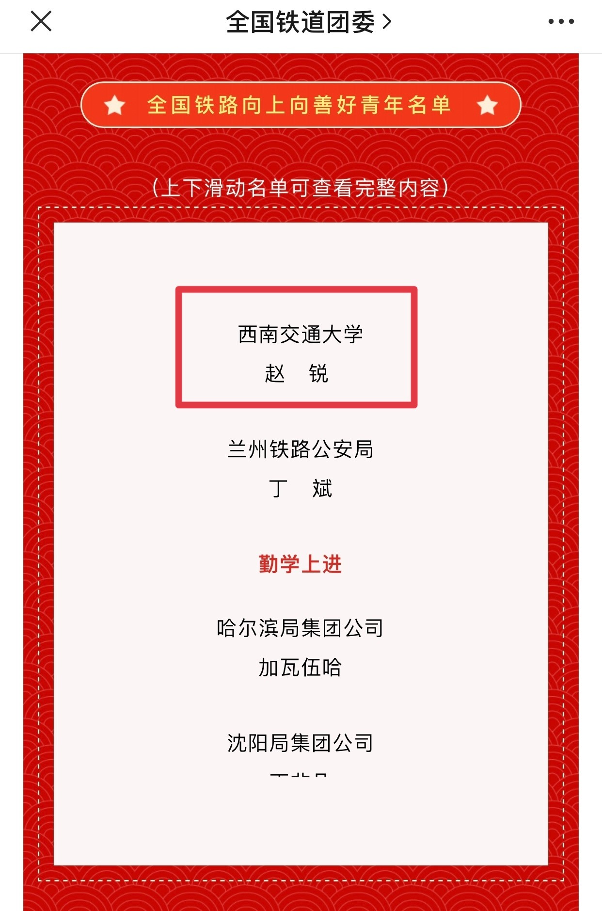 审核推荐、校团委研究审议、全国铁道团委层层评选,最终,我院教师裴秋明荣获“全国铁路青年岗位能手”称号,赵锐教授荣获“全国铁路向上向善好青年”称号。
