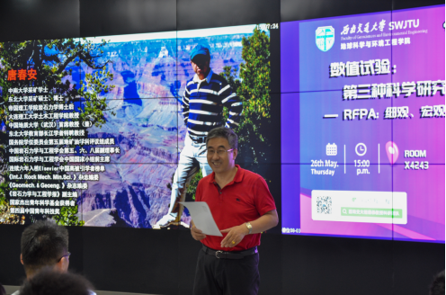 程谦恭教授邀请973计划首席科学家、大连理工大学教授、深地工程研究中心主任、中国岩石力学与工程学会副理事长唐春安教授赴我校作《数值试验:第三种科学研究方法》专题报告。程谦恭教授致欢迎词,并介绍了唐春安教授的主要科研成就。